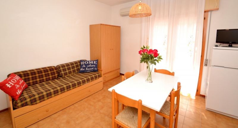 apartmán typu mono, vhodný pro 2 - 3 osoby, 130m od moře. Studio s rozkládací pohovkou pro 2 osoby + rozkládací gauč, kuchyňský kout, balkon, klimatizace, TV - satelit