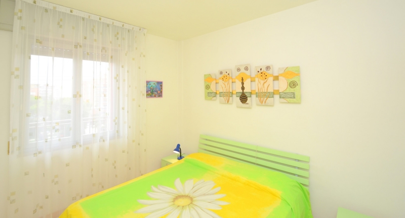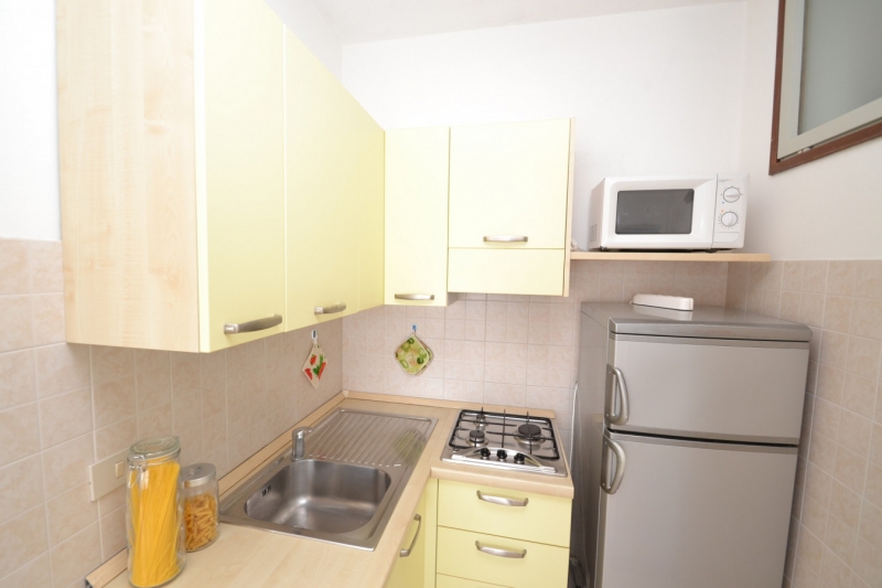 apartmán typu bilo, vhodný pro max 5 osob, 80m od moře. Dvoupokojový apartmán s ložnicí (manželská postel), výklenek s palandou, obývací pokoj s kuchyňským koutem a rozkládacím gaučem, balkon s bočním výhledem na moře, klimatizace, výtah, trezor, bezpečnostní dveře, mikrovlnná trouba, TV